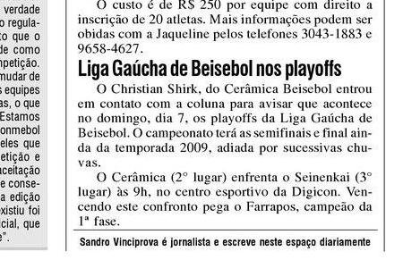 Jogando em obscuridade relativa desde sua formação há dois anos, a time de beisebol do Cerâmica está conquistando, passo a passo, seu espaço na cena esportiva local. Classificado para a semifinal dos Playoffs da Liga Gaúcha de Beisebol, o time foi divulgado nos dois diários de Gravataí. O Correio de Gravataí anúnciou a participação do Cerâmica nos playoffs na sexta-feira passada (26/02), e no dia de hoje (04/03) o Jornal de Gravataí incluiu uma matéria de uma página com fotos. O Cerâmica Beisbeol agradeça os jornais pela divulgação enquanto prepara-se a enfrentar o Seinenkai, válido para uma vaga na final contra o Farrapos. O título de campeão estadual aguarda o vencedor deste confronto que encerrará a temporada prorrogada de 2009.