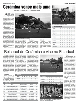 O Jornal de Gravataí de hoje (Edição 793 – terça-feira, 9 de março de 2010) inclui uma reportagem dos Playoffs 2009 da Liga Gaúcha de Beisebol que foram disputados pelo ontem em Gravataí. A matéria contém resumos e placares da semifinal e da final e a escalação do Cerâmica no final. O time agradece o Jornal de Gravataí pela divulgação. Confira a matéria no jornal virtual no internet ou clique na imagem ao lado para a ampliar.