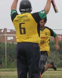| Steve celebrates Robson scoring a run in the state league debut. |